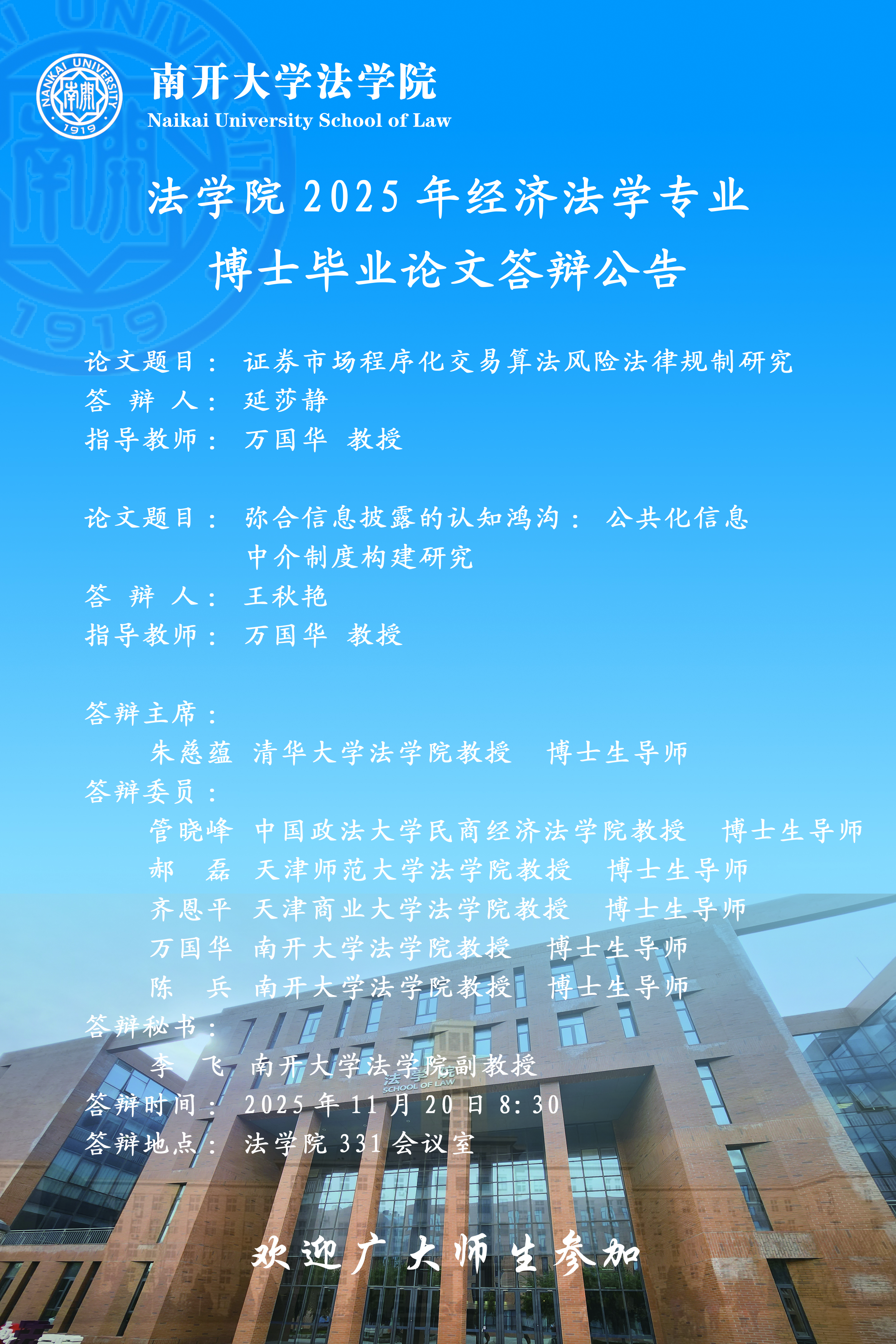 法学院2025年(12月)经济法学专业博士毕业论文答辩公告