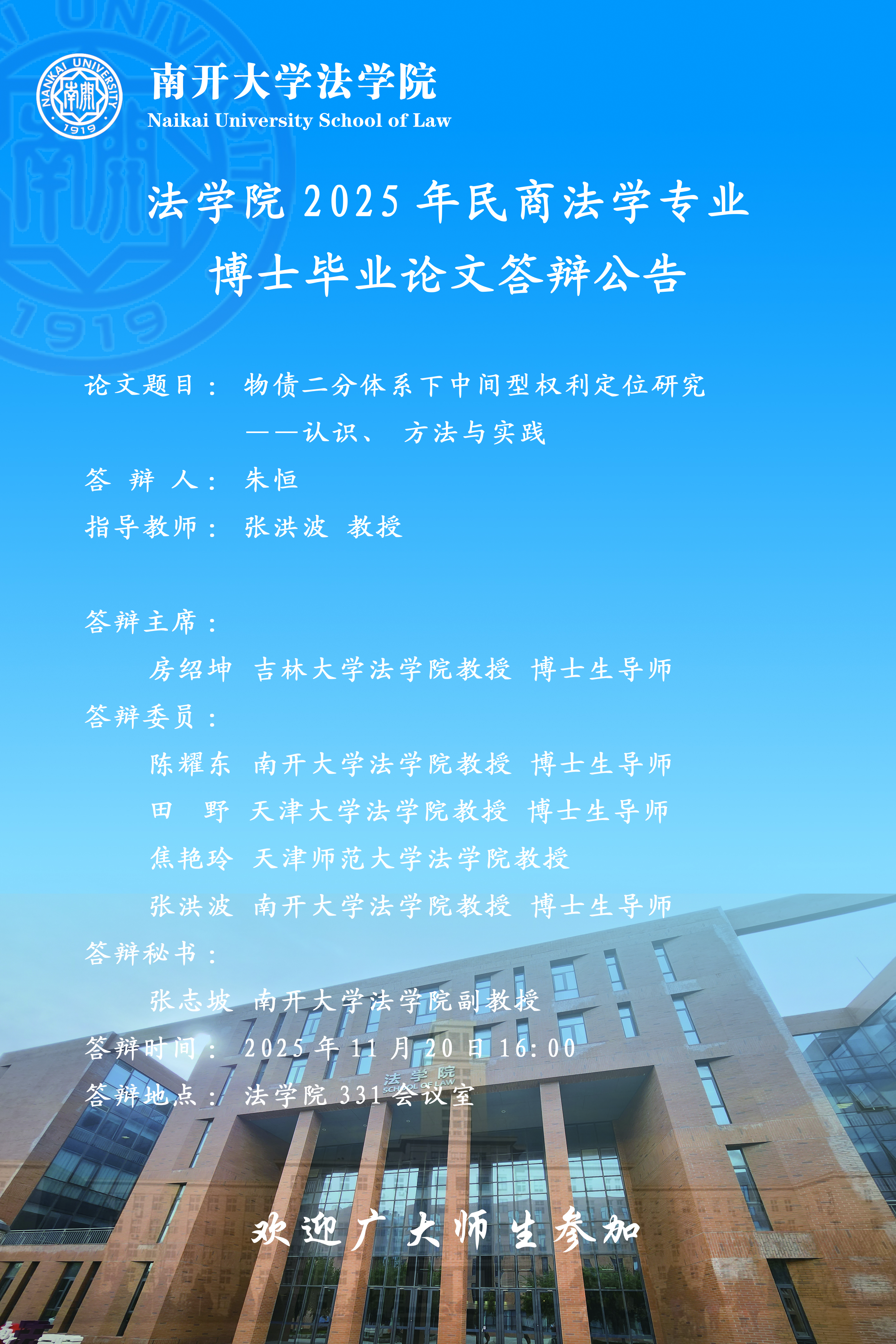 法学院2025年(12月)民商法学专业博士毕业论文答辩公告